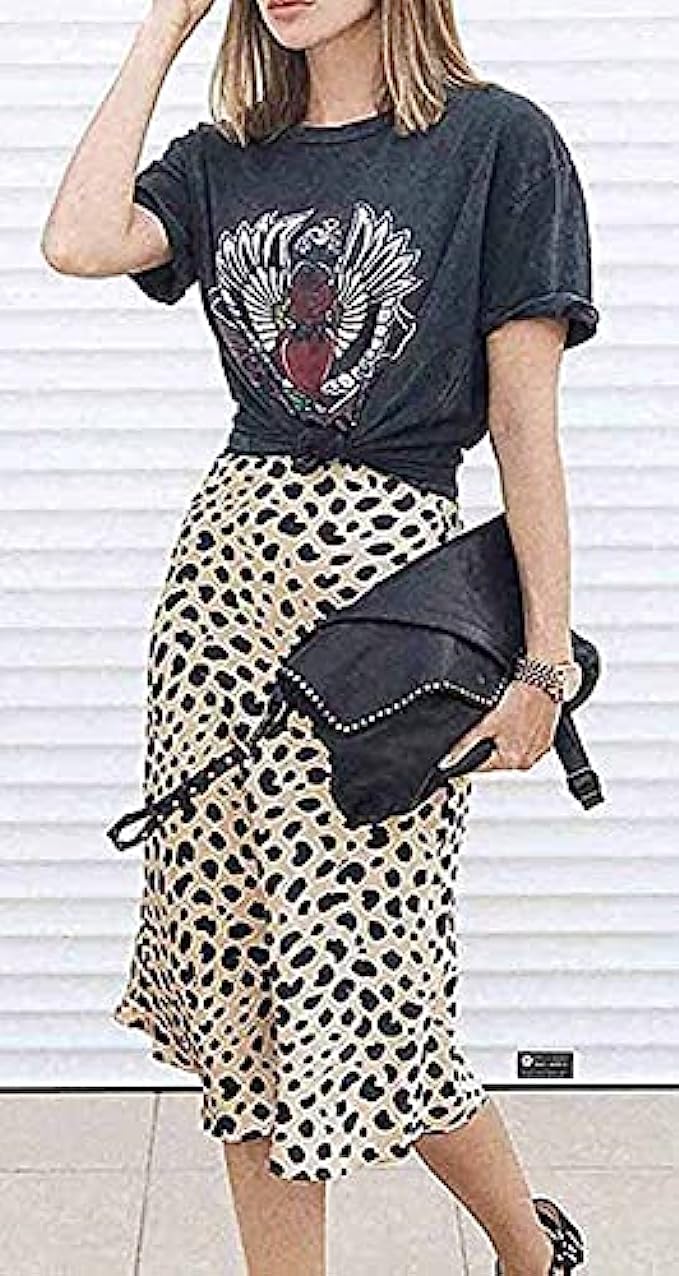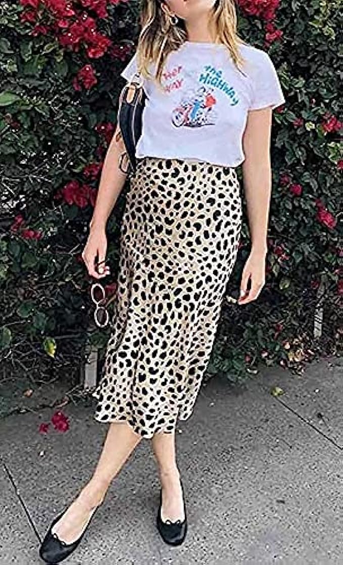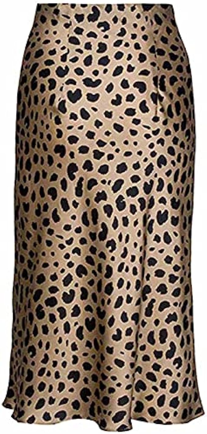 Leopard Skirt for Women Midi Length High Waist Silk Satin Elasticized Cheetah Skirts