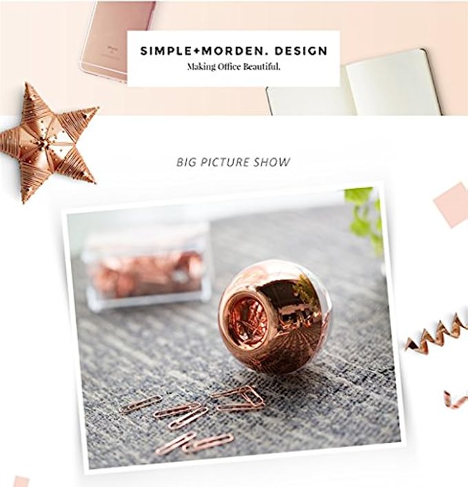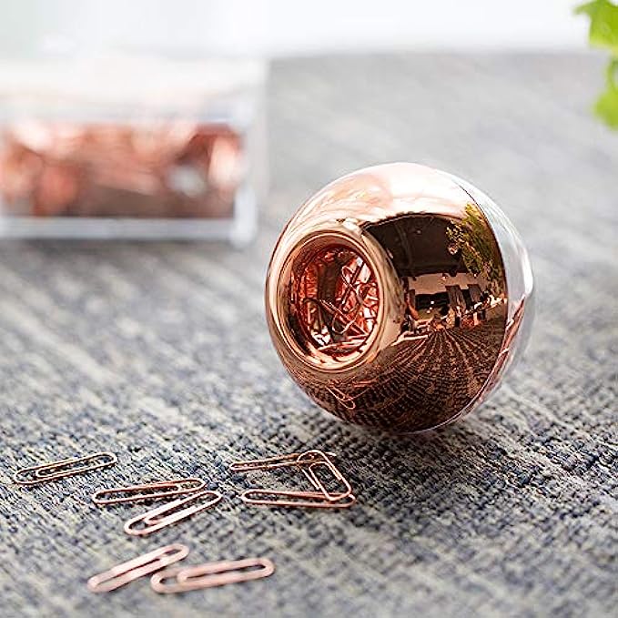 • Rose gold paper clips in round paper clip holder with magnetic lid, simple + modern design, making office beautiful