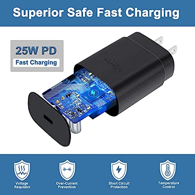 25W Samsung Super Fast Charger: Equipped with an USB Type C port, the Power Delivery 3.0 USB C wall charger provides you Max 25W output power. You can charge your deivce back to full power in no time by using the 25W USB C charger for Samsung galaxy S22, S22 Ultra, S22+, S22 Plus, z fold3 5G, z flip 3, S21, S21 Ultra, S21 Plus, Note 10 and more. You can charge your Phone to 60% in just half an hour, 5 times as fast as standard USB C wall charger. 10FT C Charger Cable Fast Charging: The 25W super fast type c charger is equipped with extra longer 10FT Type C to C cable, offering a user-friendly reversible design and longer charging distance, fast charging and up to 480 Mbps data transfer speed. The power output up to 3 Amp and 100-240 volt input of this 2pack Samsung super fast chargers can charge two devices simultaneously, ideal for worldwide travel with your partner! Super Fast Charger Universal Compatibility: The Samsung S22 Ultra fast charger kit supports most of USB C devices, including Samsung Galaxy S21/ S21+/ S21 Ultra 5G/ S22/S22+/S22 Ultra/Note10/ 10+, Note 20/20 Ultra 5G, S20/S20+/S20 Ultra 5G/ S20 FE(Fan Edition) 5G, S10, S10+, Galaxy Z fold 3/ Galaxy Z Flip 3,S10e, S9, S9+ Plus, S8, S8+ Plus/Active, Google Pixel, Pixel 2, Pixel 3, Pixel XL, Pixel 2XL, Pixel 3XL, Pixel 3A, LG G7 Thing, G6, G5, V20, V30, V35, V30S, V40 ThinQ Plus, etc. Safety Assurance: The Samsung galaxy S22 super fast charger is built in intelligent chips, which can protect your devices against damage caused by short circuit, over-current, over-voltage, over-heating, and over-charging issues. Automatically stops charging when battery capacity is full to ensure your device safety and longevity. What You Get: 2-PACK 25W super fast chargers and 2-PACK 10FT Type C to C cables. 24*7 friendly customer support ensures your pleasing shopping experience. If there is any problem, please do not hesitate to contact us!