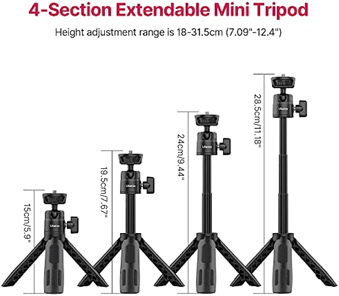 • Compact and Portable Tripod: The mini tripod adopts 3-stage telescopic method, which can be extended to 18cm-31.5cm/7.08inch-12.4inch. The storage size is 18cm/7.08inch, and it only weighs 135g, making it easy to put in a bag