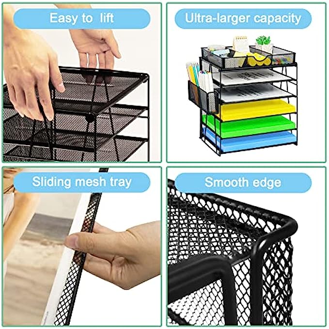 【Super Large Capacity】5 tier desk organizers and storage is ideal for your office, it has enough storage space for all your desk supplies can sort your files, paper, which is very convenient for you to find the files you need. This Letter tray design hanging pencil holder (with built-in hooks) has two to organize all your pens and pencils, and the sliding drawer can be placed at will and provides great space for your desktop.