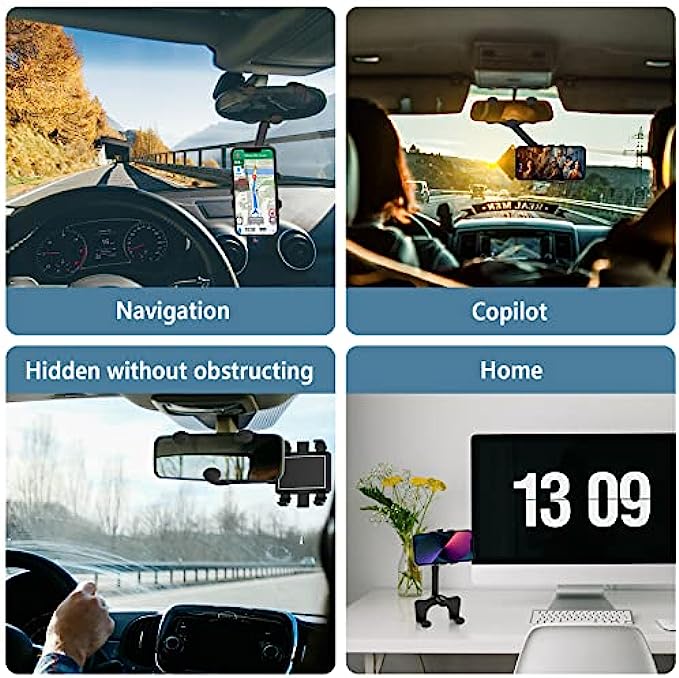 - 360-Please note: 1. The thickness of the rearview mirror is 3-6cm, and the height is 6-9cm; 2. If your rearview mirror is very close to the front windshield, it is not recommended that you buy it, otherwise it cannot be used in your car. degree rotation adjustment, you can always find the angle that suits you. - Thickened silicone pad, Vientiane roller, exquisite workmanship, light and durable. - Retractable and adjustable rods, which can be long or short, can be adjusted as needed, and can be retracted and hidden behind the rearview mirror, without affecting the vision of driving. - Driving navigation, live broadcast, video shooting, watch TV show, you can try it in any occasion where you need it.
