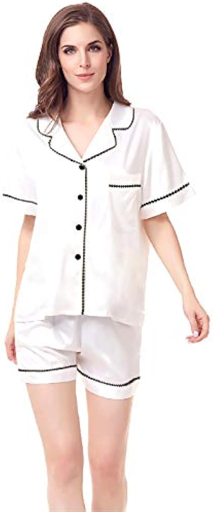 Women Silky Satin Pajamas Short Set Plain Matte Two-Piece Pj Sets Button-Down Sleepwear With Contrasted Piping