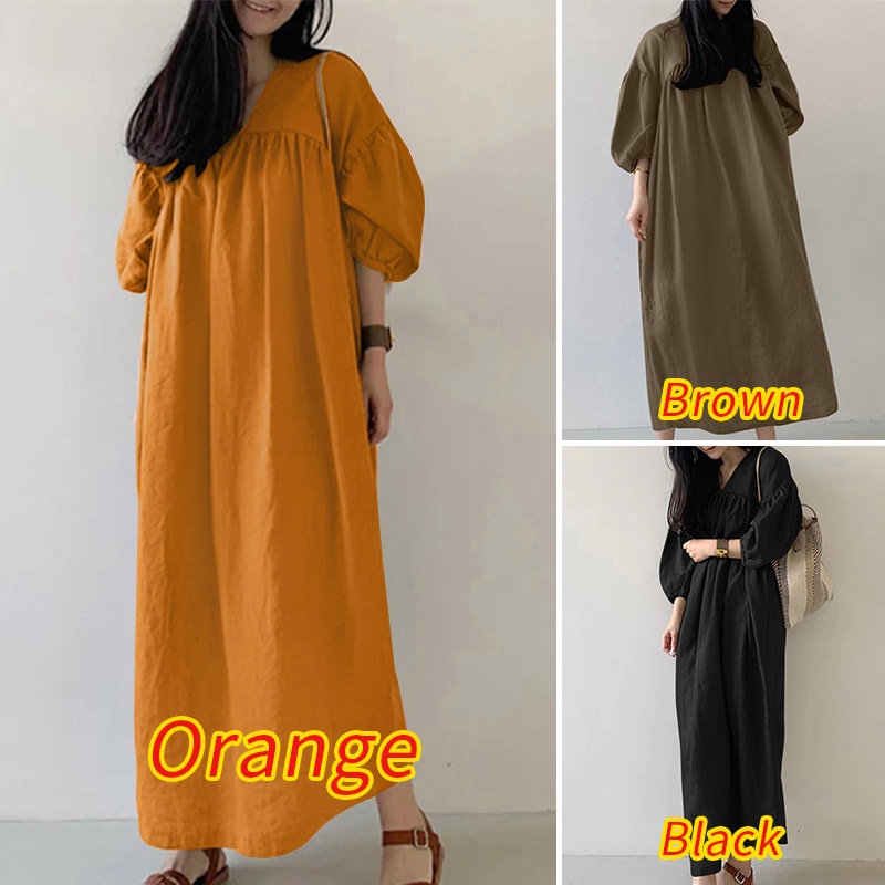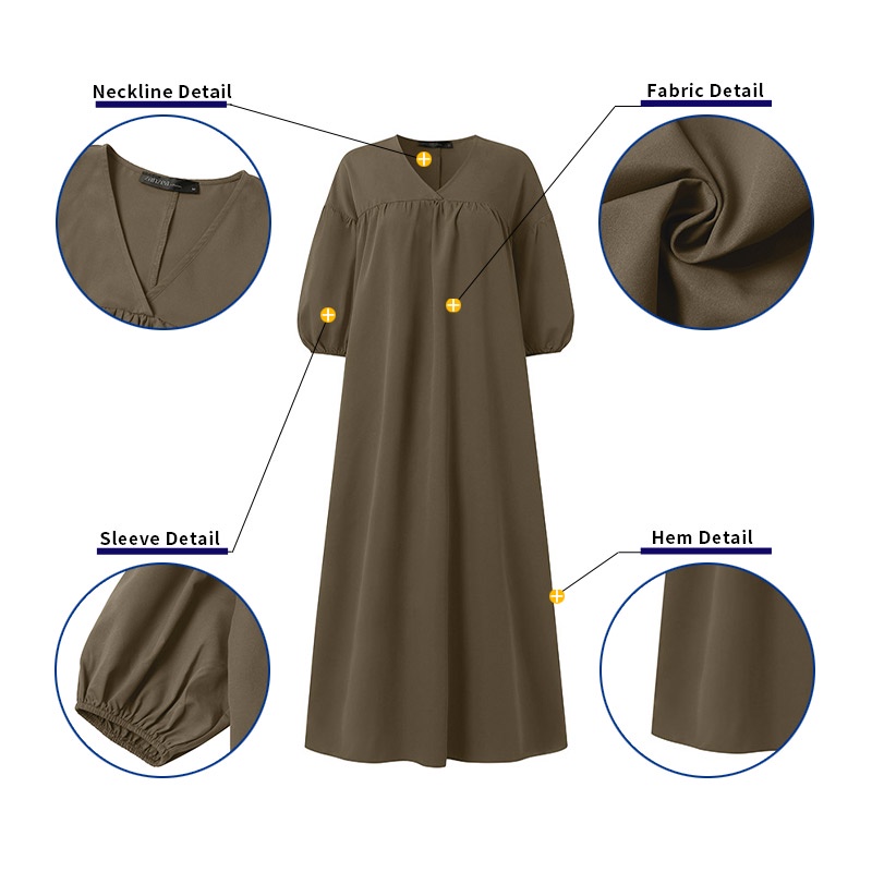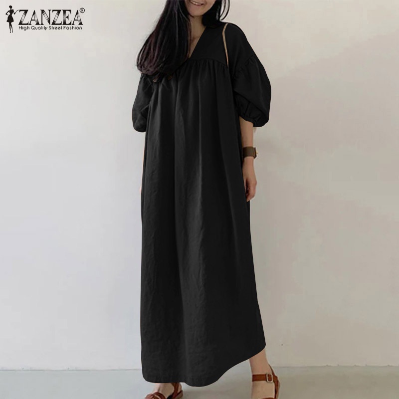 ZANZEA Women Fashion Elegant Solid V-Neck Three Quarter Luxurious Puff Sleeve Side Pockets Casual Dresses